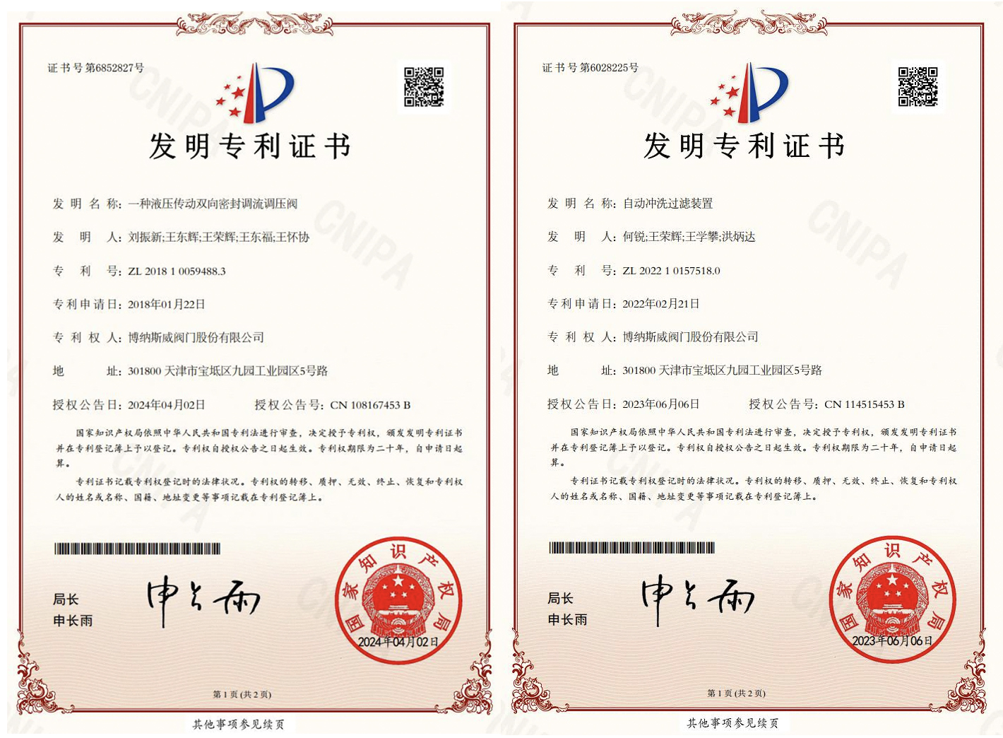 博納斯威閥門股份有限公司持續(xù)創(chuàng)新,近期,自動(dòng)沖洗過(guò)濾裝置、軸流式雙級(jí)雙向調(diào)節(jié)閥、閥桿水平驅(qū)動(dòng)式偏心半球閥、對(duì)沖消能軸流式角旋閥、一種帶有內(nèi)置阻尼裝置的消聲緩閉止回閥、一種防水錘蝶閥、一種輸入端帶有非同步鎖定機(jī)構(gòu)的驅(qū)動(dòng)裝置、一種液壓傳動(dòng)雙向密封調(diào)流調(diào)壓閥等八項(xiàng)新技術(shù),先后獲得國(guó)家知識(shí)產(chǎn)權(quán)局授權(quán)發(fā)明專利!迄今為止,博納斯威獲得專利總數(shù)量達(dá)到276項(xiàng),其中發(fā)明專利27項(xiàng),實(shí)用新型185項(xiàng),外觀專利64項(xiàng)。