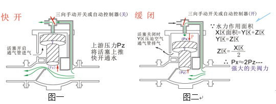 ● 一旦系統(tǒng)壓力消退至導(dǎo)閥設(shè)定值以下時,則以可調(diào)節(jié)的速度緩慢關(guān)閉閥門,如圖二;