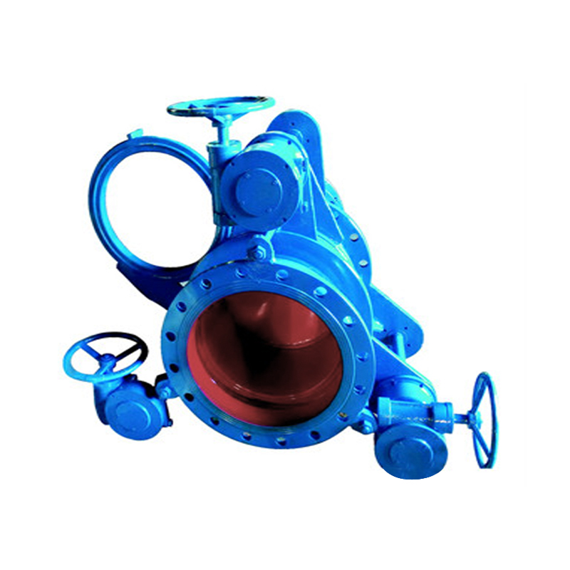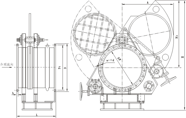 F343CX蝸輪盲板閥又稱蝸輪扇形眼鏡閥,翻板閥,扇形閥,由左閥體、中閥體、右閥體、扇形盲板、絲桿螺母、不銹鋼補(bǔ)償器、兩個蝸輪傳動機(jī)構(gòu)等組成。它是通過三根絲桿連成一體,并把三個閥體分別固定在底座上,構(gòu)成一個剛性結(jié)構(gòu)體。中閥體與右閥體用不銹鋼膨脹管連接,左、中閥體分別用三根兩端帶左右梯形螺紋的絲桿連接,將三根絲桿同時作正向(或反向)旋轉(zhuǎn),則左、中兩閥體得到壓緊(或分離)。三根絲桿中上面一根絲杠中間裝有盲板,盲板繞該軸心旋轉(zhuǎn)。下面兩根絲桿在同樣的部位上安裝有盲板的定位塊,盲板旋轉(zhuǎn)時可以防止盲板漂移,避免密封圈擦傷,其中一根絲桿上裝有蝸輪傳動機(jī)構(gòu),實現(xiàn)松開夾緊閥體的目的。